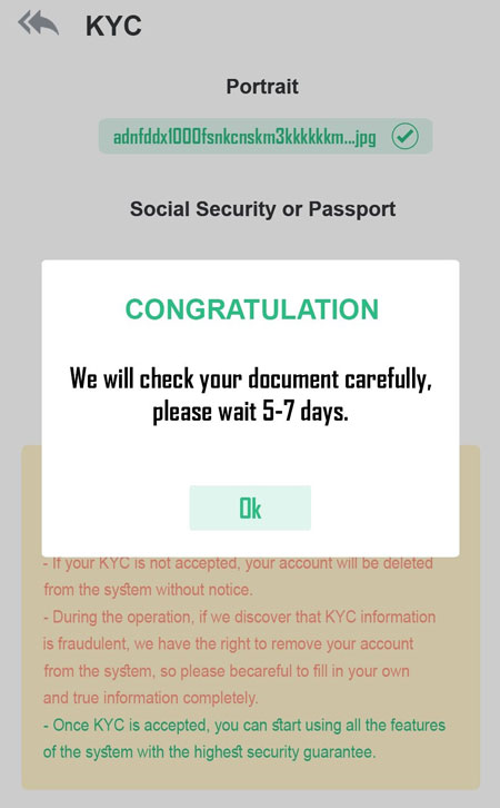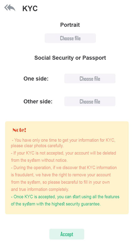 KYC is a mandatory procedure before fully using all functions, because of relating to money, KYC to verify user identity is a must before using any service in the ecosystem. This guarantees the legality of the user in the event of a dispute or claim. KYC information will be kept secure and used only to verify real user, and not used for any other purpose. Click on “KYC” icon in the user’s account.