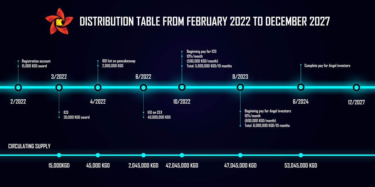 All users who complete KYC & the total purchase reaches the buying milestones, they will receive KGD rewards and transfer to their personal wallets immediately, and can trade as soon as KGD coin is listed on CEX or DEX.
