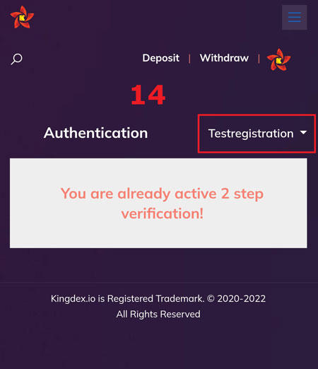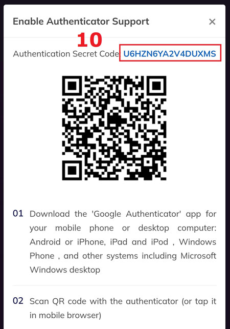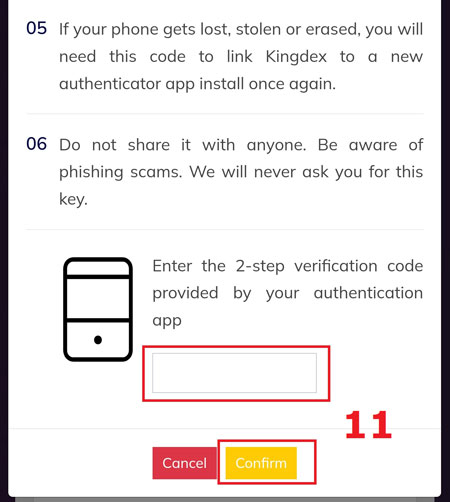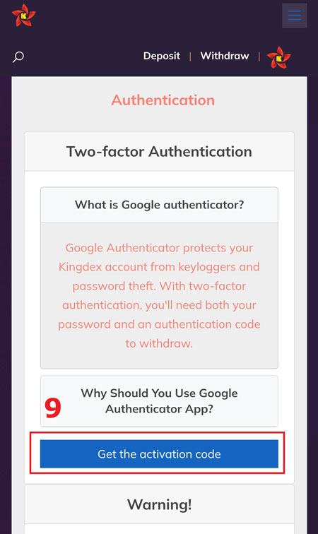Step 4: In the Google authentication verification interface, click the "Get the activation code" button to get the installation code. Copy the installation code and install it according to the instructions "Google Authentication installation guide?". The setting code should be kept in a secret place so that it can be reset when changing to another phone. In case, the installation code is lost, you can contact the admin by email: kingofgameanddex86@gmail.com, to get it back, the cost of getting the code back is 5 usdt for each reset code.