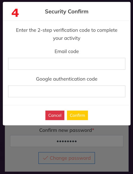 Step 4: Filling in two-factor verification information including email verification code and Google Authentication, then click on "Confirm" button to complete.